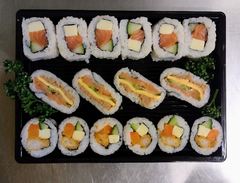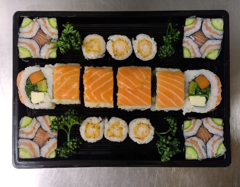 Veuillez réserver deux heures à l'avance. 4 rouleaux carrés en forme de brique : saumon frais, saumon fumé, concombre. 6 california rolls au saumon : surimi, radis mariné jaune, algue nori. 6 maki crevette.Attention !