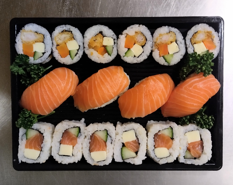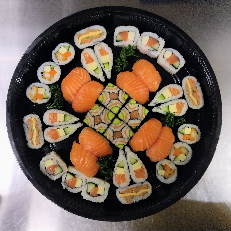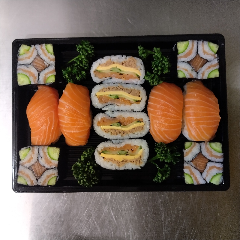 Veuillez réserver trois heures à l'avance. 4 rouleaux carrés en forme de brique : saumon frais, saumon fumé, concombre. 8 sushis au saumon. 8 rouleaux en forme de cœur : saumon, fromage frais, concombre. 6 california rolls : saumon, fromage frais, concombre. 6 futomaki : crevette, fromage frais, concombre, surimi. 4 rouleaux carrés : thon cuit, saumon fumé, fromage frais, concombre.
